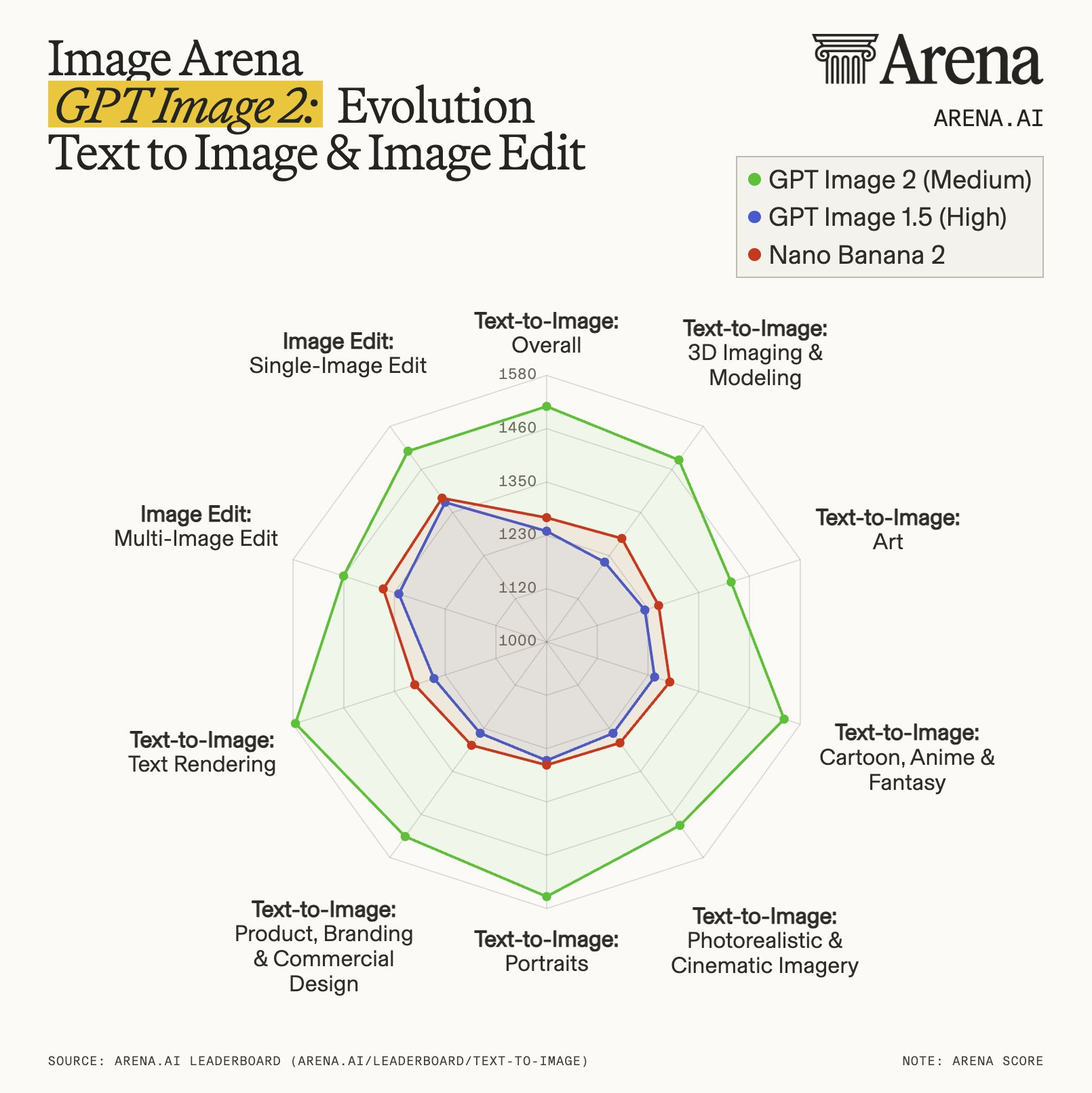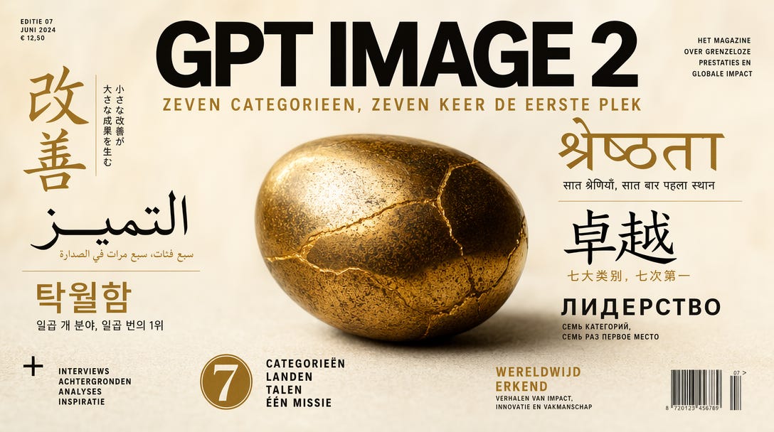Het verschil in benchmarks is groot. Image Arena is het leaderboard waar AI-imagemodellen blind tegen elkaar worden vergeleken door gebruikers. GPT Image 2 staat daar sinds maandag op #1 in elke categorie. Text-to-Image: 242 ELO-punten voorsprong op Google’s Nano Banana 2. Dat is de grootste voorsprong die Arena ooit heeft gezien. Ter vergelijking, de sprong van GPT-4 naar GPT-5 op het algemene chat-leaderboard was ongeveer 80 punten. Dit is ruim drie keer zoveel, in één update, op één vlak.
