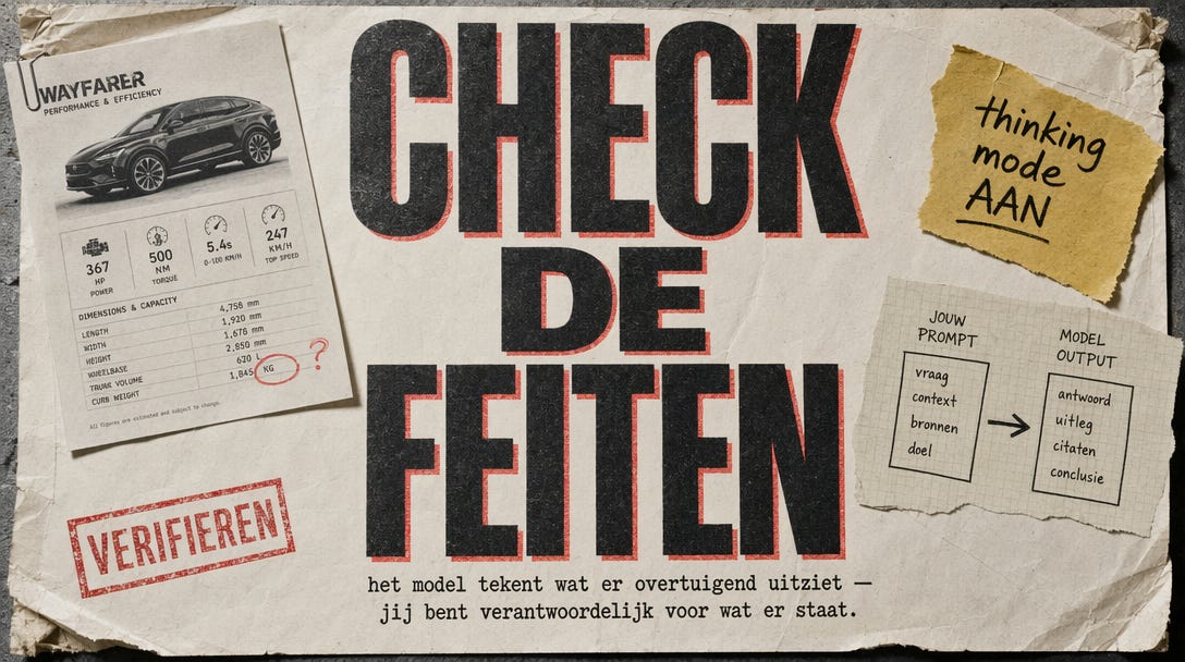Fact-check wat het model tekent, altijd. Thinking mode kan zoeken, maar zoeken is niet weten. Ik zag een test waar iemand het model een infographic over de Toyota Sienna modellen liet maken, de lay-out er prachtig uit. Maar één uitvoering stond niet in het plaatje, en bij een ander model stond een maanluik genoemd dat niet bestaat. Net als bij tekst tekent het model iets dat er overtuigend uitziet, jij bent eindverantwoordelijk voor wat er staat.