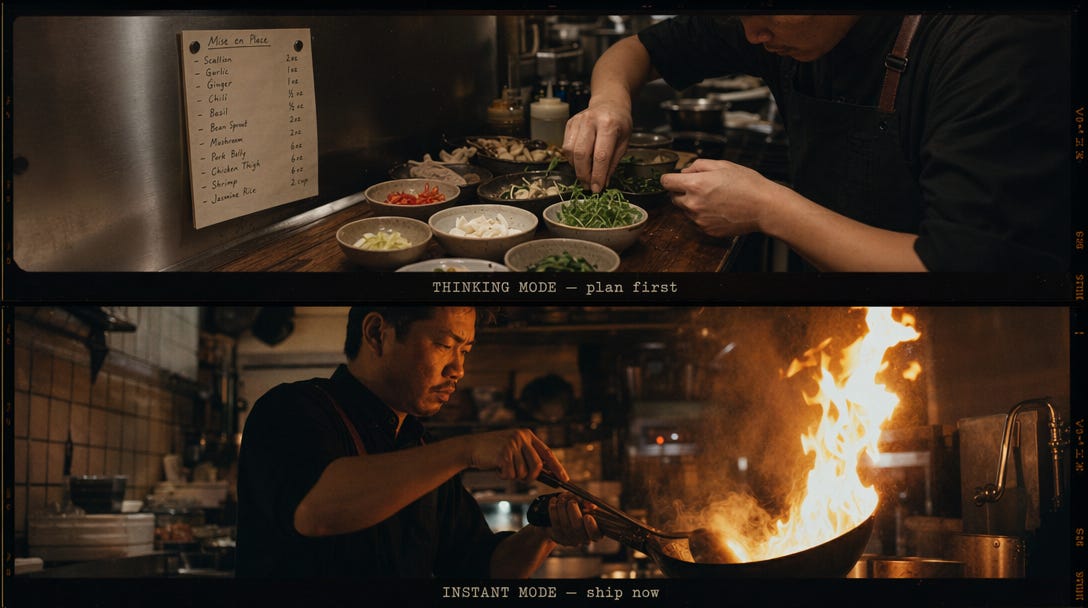 Net als een sous-chef die het recept eerst helemaal doorleest en zijn mise en place voorbereidt voor hij de pan aan zet. Instant mode is de kok die meteen begint koken zodra de bestelling binnenkomt. Voor een omelet prima. Voor een zevengangenmenu is dat geen goed idee.