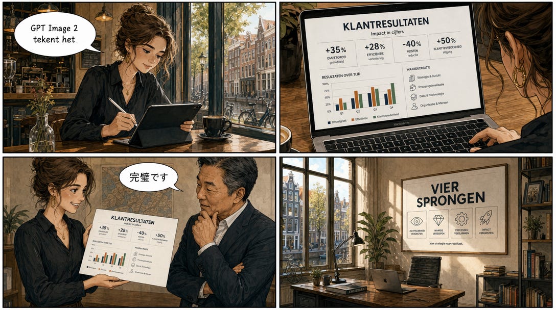 Meerdere plaatjes tegelijk, met samenhang. Tot vorig jaar genereerde je één plaatje per prompt. Wilde je een manga van vier pagina’s? Dan moest je vier keer genereren, hopen dat je personages enigszins hetzelfde bleven, en de rest in Photoshop fixen. GPT Image 2 maakt in één generatie een serie waarin karakters, stijl en verhaal consistent blijven. In de livestream tekende het team een storyboard met dezelfde hoofdpersoon over drie pagina’s. Zelfde gezicht, zelfde kleding, doorlopend verhaal. Voor marketingcampagnes, instructievideos en social carousels.