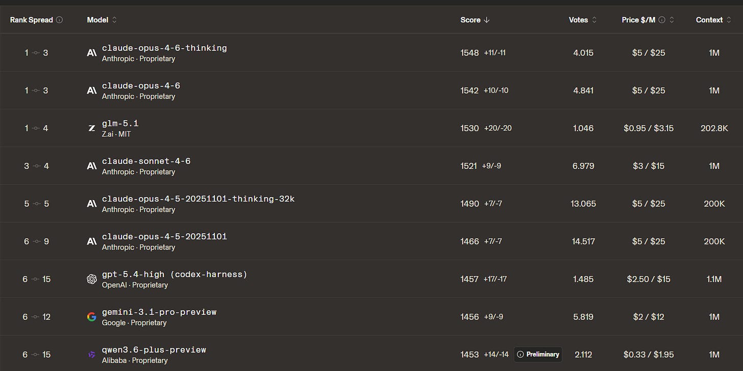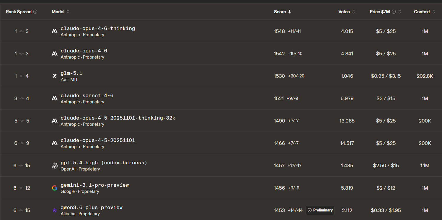 In april volgde Z.ai met GLM 5.1, een code-model. En het gaat hier ook niet om “een beetje beter”. GLM 5.1 staat op SWE-Bench Pro, een van de zwaarste benchmarks voor software-engineering, op nummer 1 in de wereld. Boven Claude Opus 4.6, boven GPT 5.4, boven alles wat Silicon Valley aanbiedt. Op Code Arena staat het op plek drie volgens de mean Elo, maar de rank spread loopt van 1 tot 4. Statistisch zit het dus in dezelfde top-tier als de twee Opus-varianten erboven. Eerste open-weights model dat ooit zo hoog komt. En voor wie de prijs erbij rekent, slaat het verhaal helemaal door. GLM 5.1 kost een fractie van wat Opus 4.6 per token vraagt, dus per euro aan output verslaat het Sonnet 4.6, Opus 4.5 en GPT-5.4 met flinke marge. MIT-licentie, gewichten op HuggingFace, gratis te downloaden.
