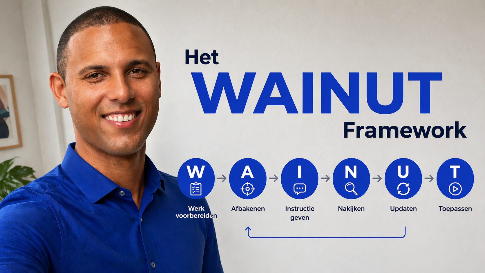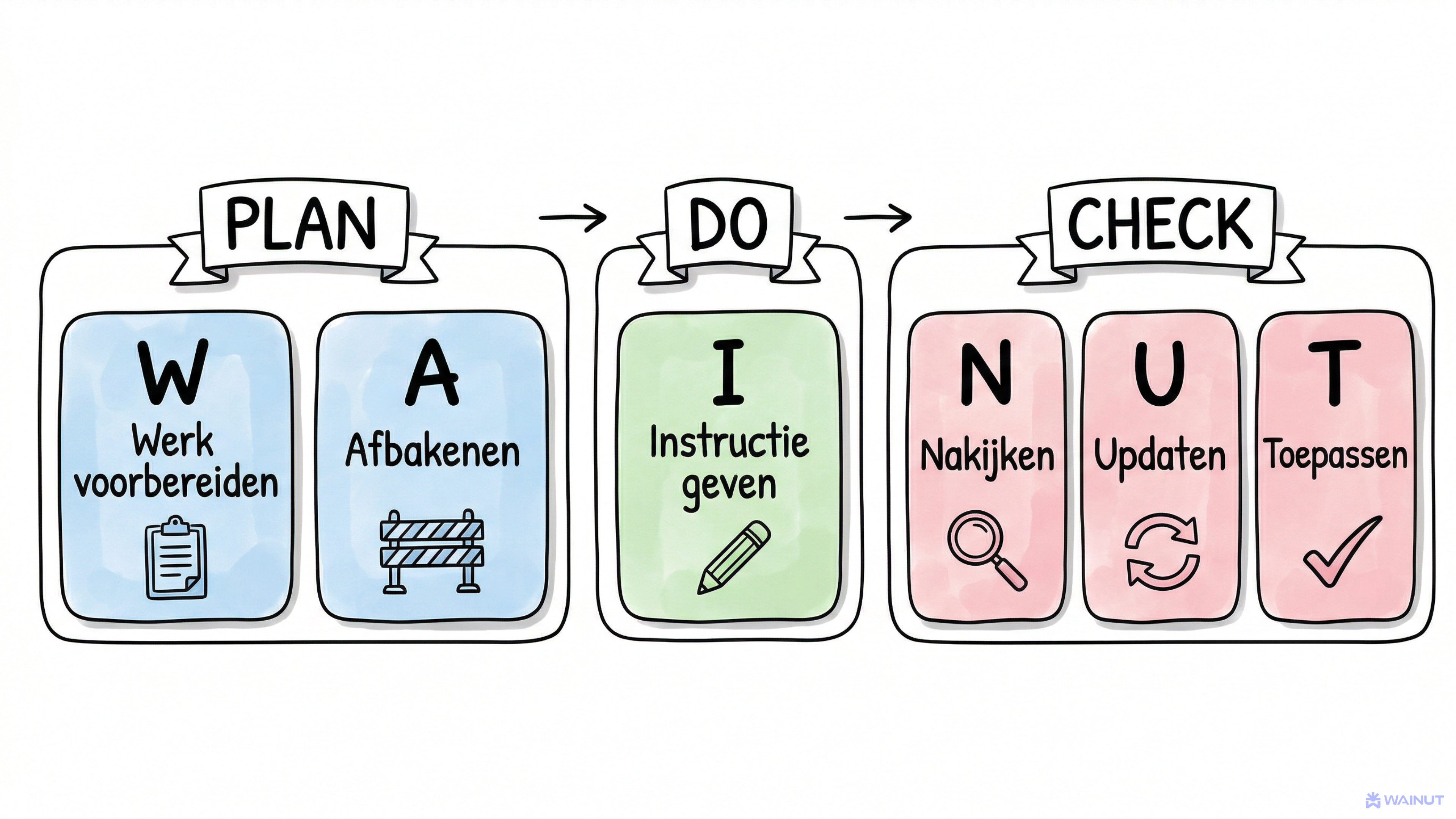 WAINUT staat voor zes stappen die je hele werkproces met AI dekken. Je kunt het vergelijken met Plan/Do/Check, het principe dat in elke organisatie bekend is.