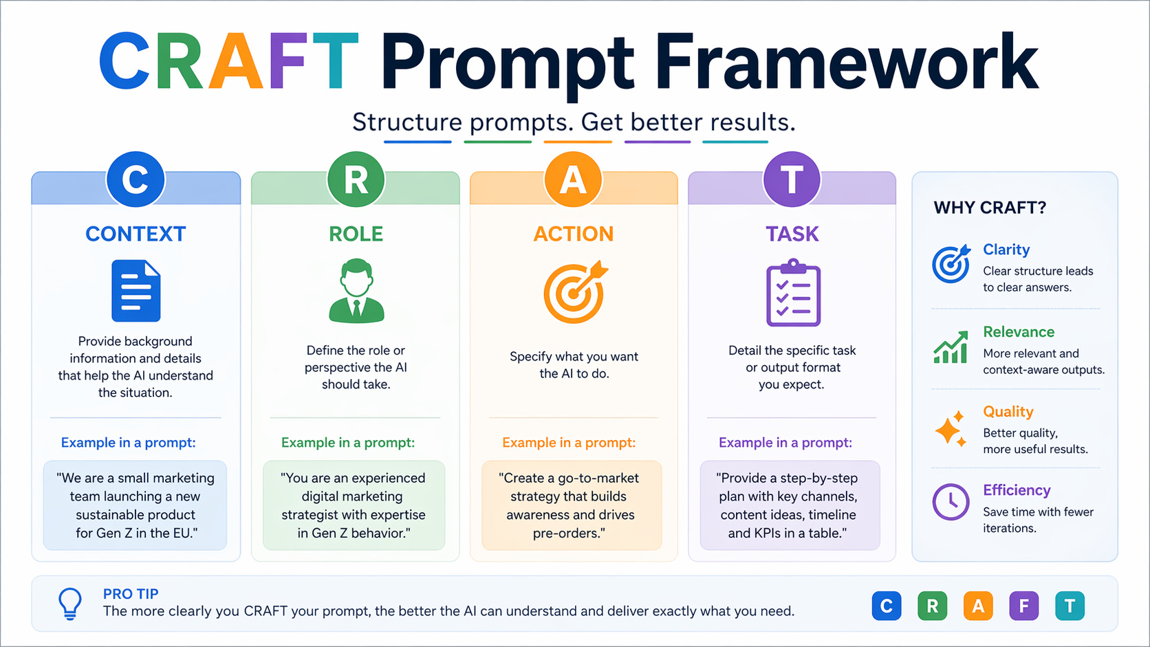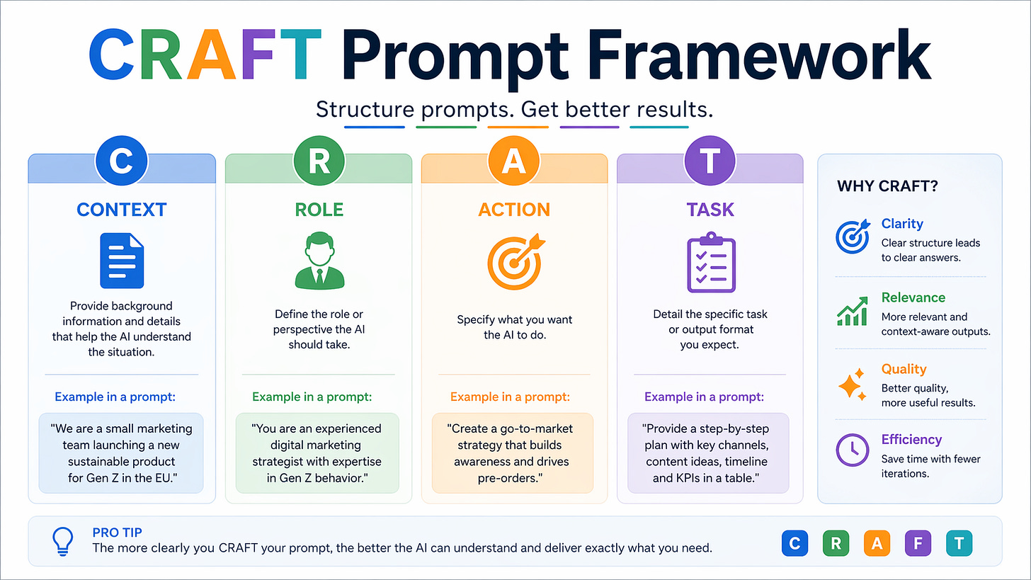 Hier schrijf je de prompt. En hier past CRAFT prima in. Context, rol, actie, taak. Niets mis mee als instrument. Maar het is stap 3 van 6.
