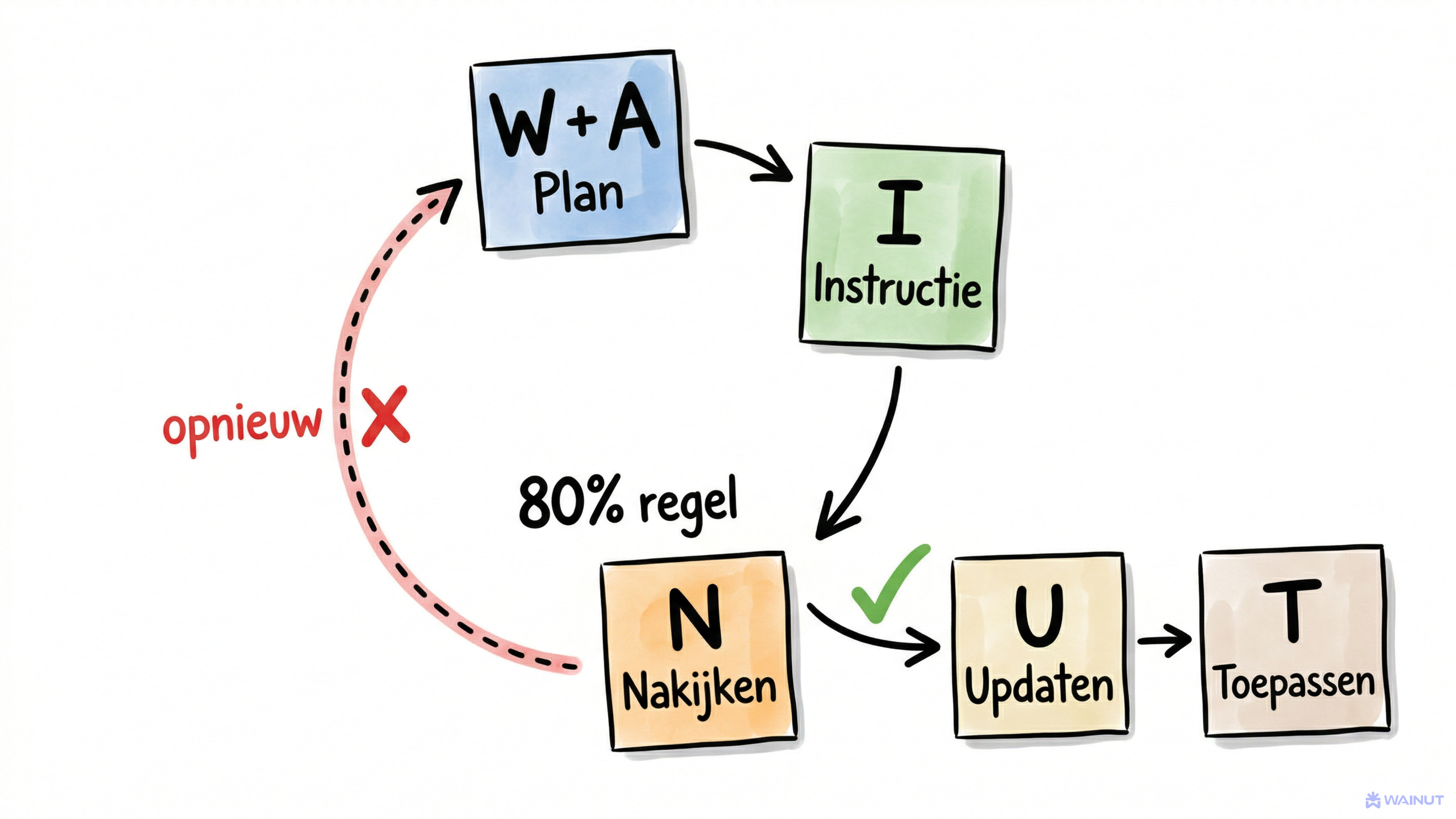 W → A → I → N → Onder 80%? → Terug naar W