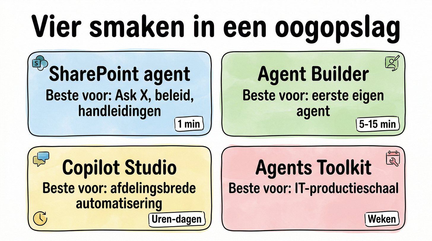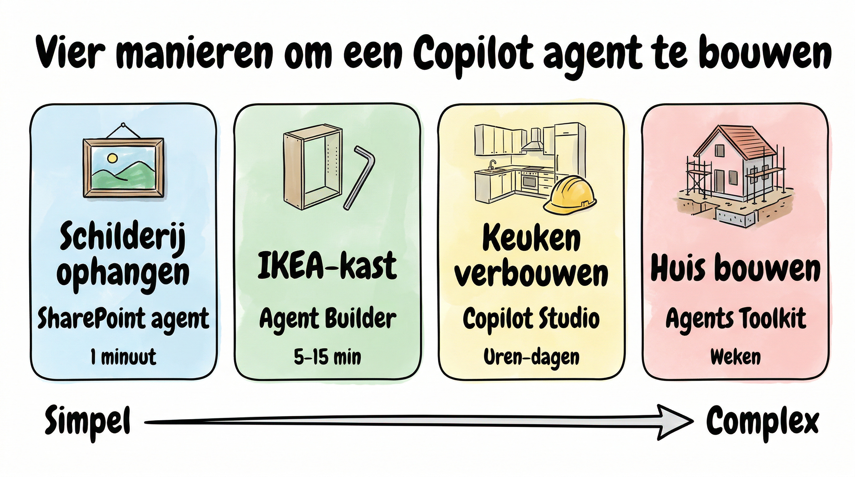 Microsoft heeft op dit moment vier verschillende manieren om een agent te bouwen, en dat is verwarrend als je erin duikt zonder kaart. Laten we ze naast elkaar zetten zoals klussen in huis, want dat is de enige manier waarop dit in één keer blijft hangen.