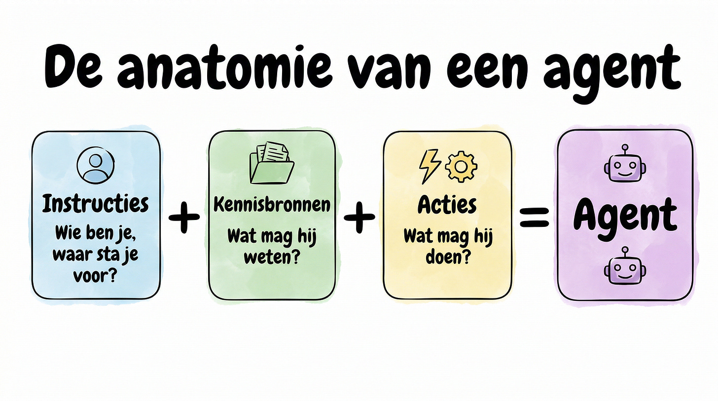 In deel 1 heb ik je meegenomen in Copilot Chat. Jij typt, Copilot antwoordt. In deel 2 zag je hoe diezelfde Copilot in je Word, Excel, PowerPoint, Outlook en Teams zit. Jij werkt, Copilot kijkt mee. Allebei die delen gingen over consumeren. Deel 3 is de switch. Nu ga jij bouwen, en laat je je agent het werk doen.
