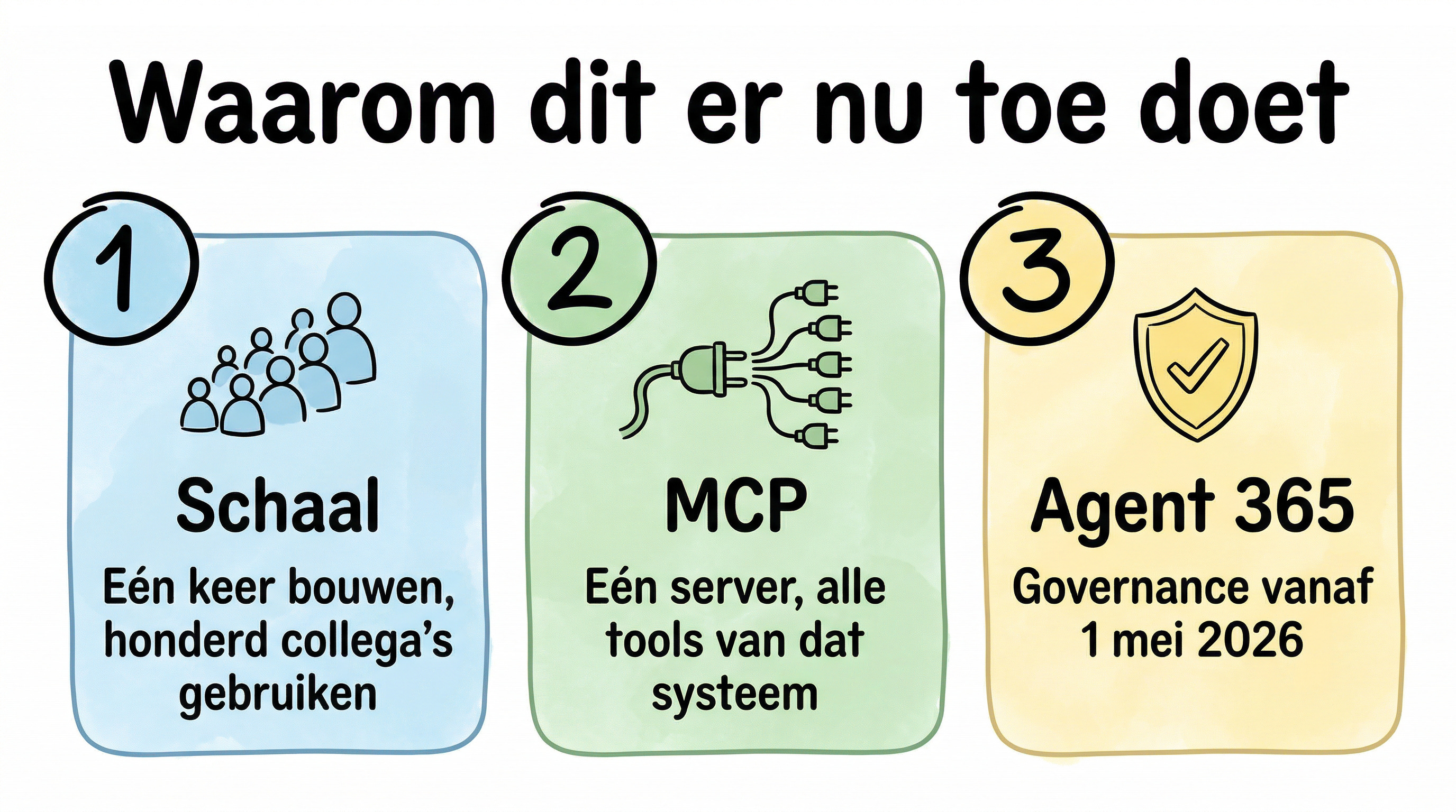 De derde reden is governance. Vanaf 1 mei is Agent 365 algemeen beschikbaar, voor vijftien dollar per gebruiker per maand. Dat is de controlelaag waar IT al een jaar op wacht. Een centrale registry van alle agents in je tenant, visuele map van wie wat heeft gebouwd, automatisch uitschakelen van inactieve agents, blokkeren van risicovolle bouwsels. Zonder Agent 365 is agent-bouwen nog een beetje als een aannemer inhuren zonder contract. Met Agent 365 heb je iets vast te pakken.