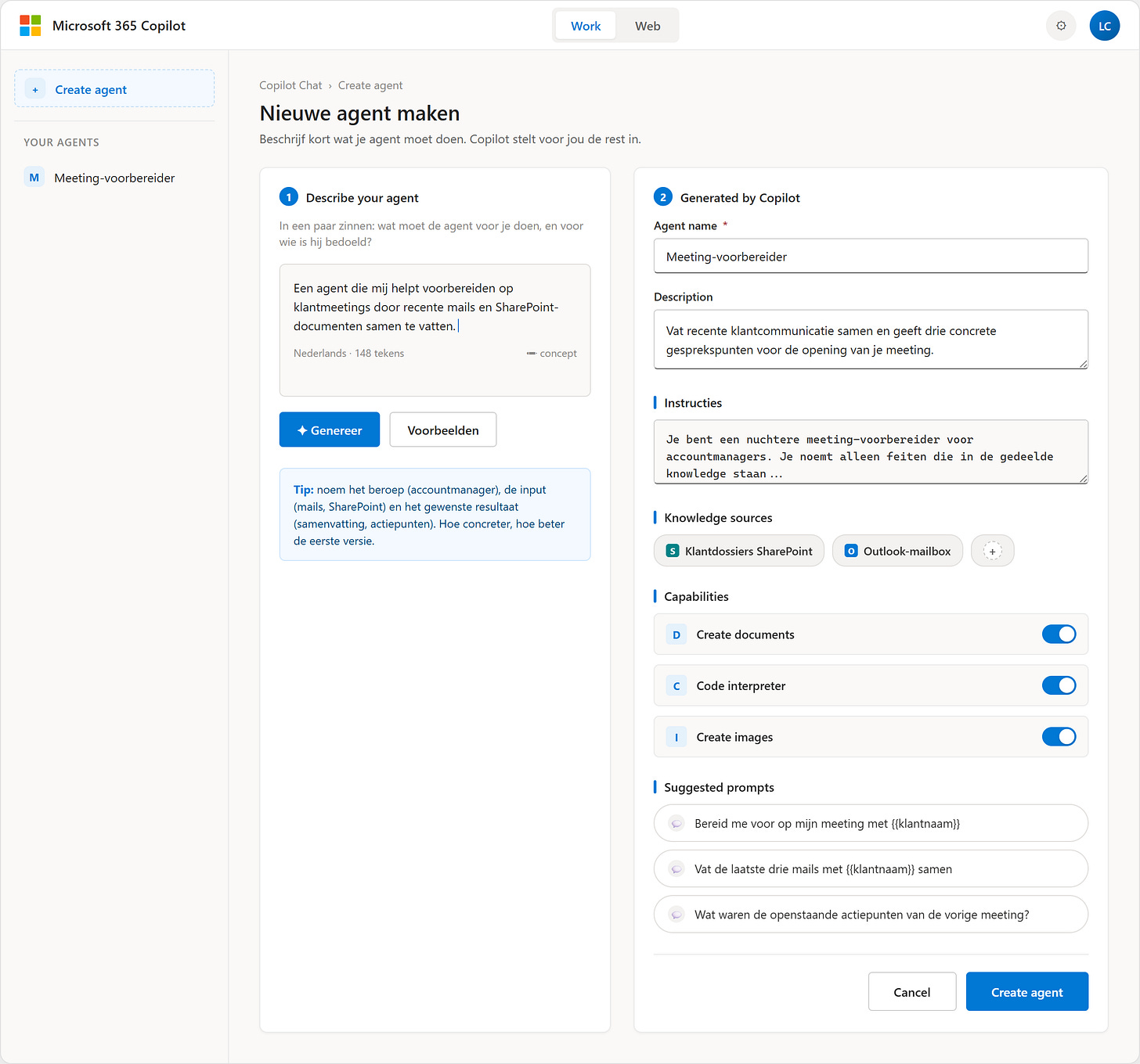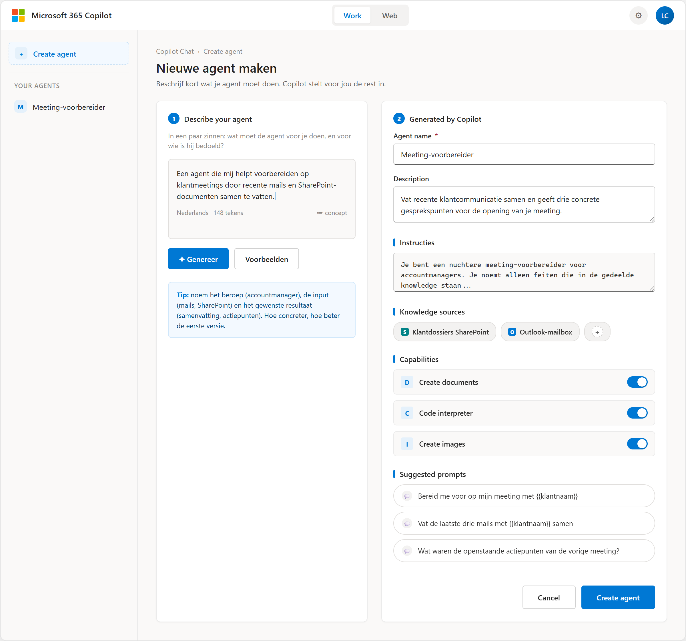 Stap 2. Beschrijf in een zin wat je wil. Typ iets als “Een agent die mij helpt voorbereiden op klantmeetings door recente mails en SharePoint-documenten samen te vatten”. Copilot genereert nu een naam (”Meeting Prep Assistant” of iets vergelijkbaars), een beschrijving, een eerste versie van instructies, en drie of vier suggested prompts. Dit is het skelet.